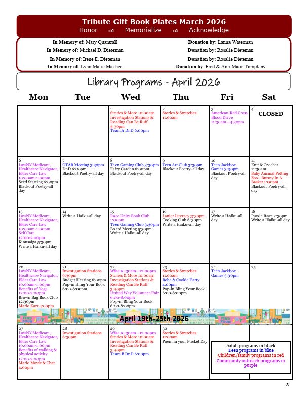 Newsletter The current copy of the Olean Public Library’s Newsletter can be found here:April 2026Every Olean Public Library Newsletter is the culmination of a month-long collaborative effort by Library staff to keep the public informed of library events and goings-on! NEWSLETTER ARCHIVE2026March 2026February 2026January 20262025December 2025November 2025October 2025September 2025August 2025July 2025June 2025May 2025April 2025March 2025February 2025January 20252024December 2024November 2024October 2024September 2024August 2024July 2024June 2024May 2024April 2024March 2024February 2024January 20242023December 2023November 2023October 2023September 2023August 2023July 2023June 2023 May 2023 April 2023 March 2023February 2023January 20232022December 2022November 2022October 2022September 2022August 2022July 2022June 2022May 2022April 2022March 2022February 2022January 2022